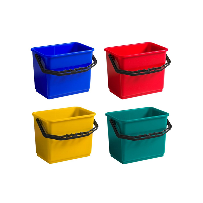 Balde plástico multiuso ideal para panos, substâncias fluidas ou como acessório para carros multiuso Alpha, garantindo organização por núcleos em diferentes ambientes profissionais.
