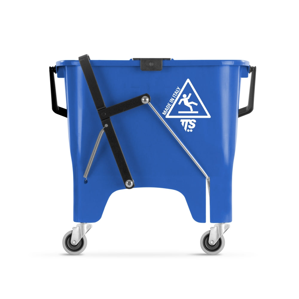 Balde de 15 L com espremedor de rolos de borracha, pedal, divisória e rodas Ø 50 mm, ideal para uso semi-profissional. A divisória permite separar a água de enxágue do espremedor químico e combinado. Disponível com sistema de cores para organização.