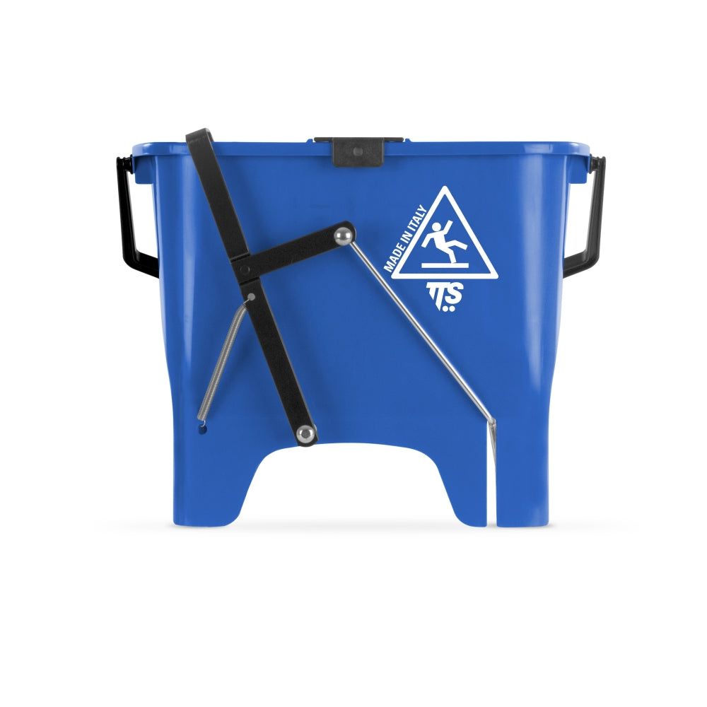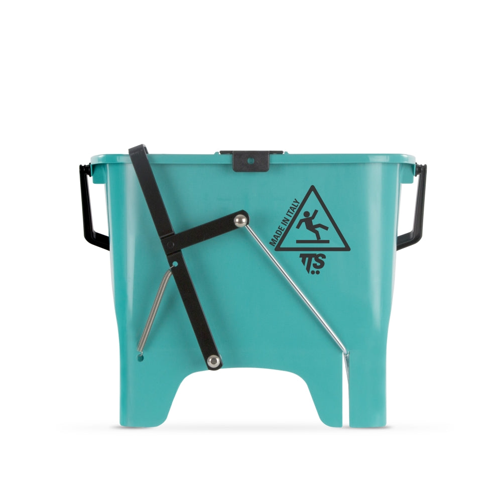 Balde de 15 L equipado com espremedor de rolos de borracha, pedal e divisória, sem rodas. Ideal para uso semi-profissional e compatível com sistemas de abas, bolsos e esfregonas. Sistema de cores disponível para organização.