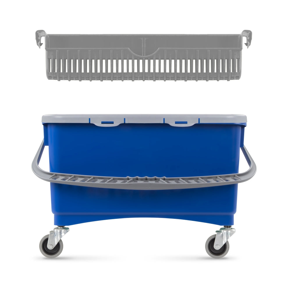 Balde de 28 L em polipropileno, equipado com alça, espremedor e rodas Ø 50 mm, ideal para operações de tratamento de pisos. Disponível com ou sem tampa.