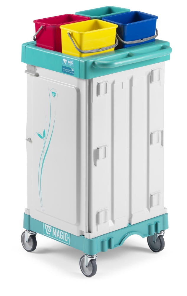 Carro multiuso em polipropileno, modular e personalizável, ideal para operadores que organizam a limpeza por tarefas ou em conjunto com ganchos Magic+.